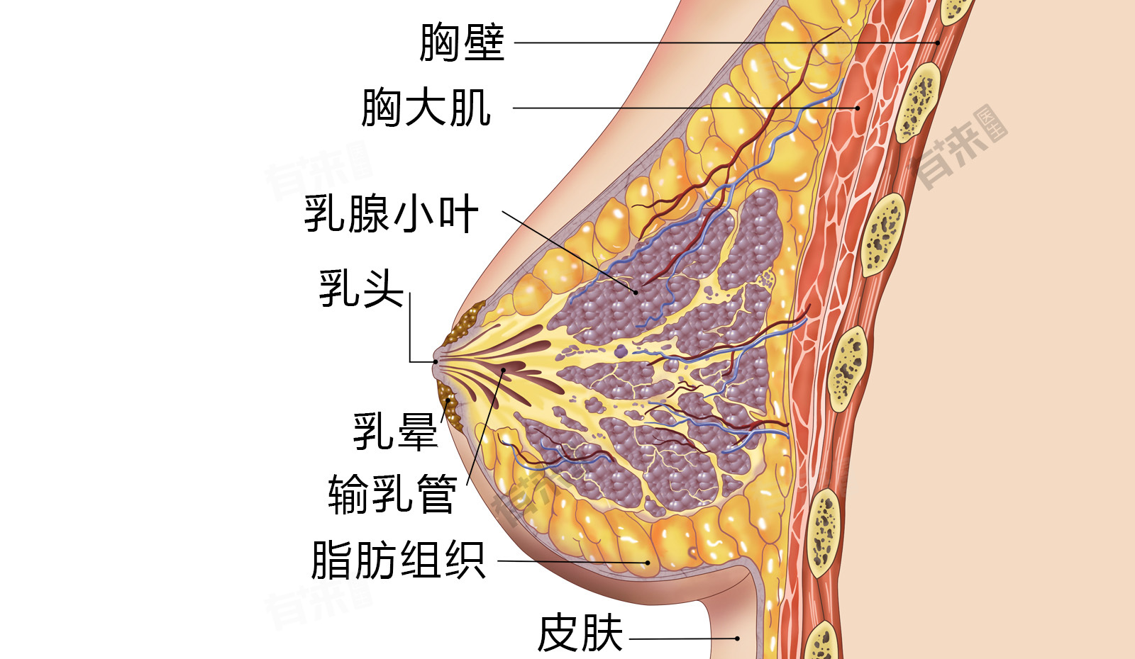 - 乳房主要由腺体组织、脂肪组织和结缔组织构成。乳腺是乳房的核心组成部分,它由15到20个分叶组成,每个分叶又包含若干小叶,这些小叶通过导管系统最终开口于乳头。乳腺负责生产乳汁,在怀孕和哺乳期间发挥重要作用。除了乳腺,乳房中还含有丰富的脂肪组织,这决定了乳房的大小和形状,且随着个体差异明显不同,结缔组织则起到了支撑和固定的作用,帮助维持乳房的形态。