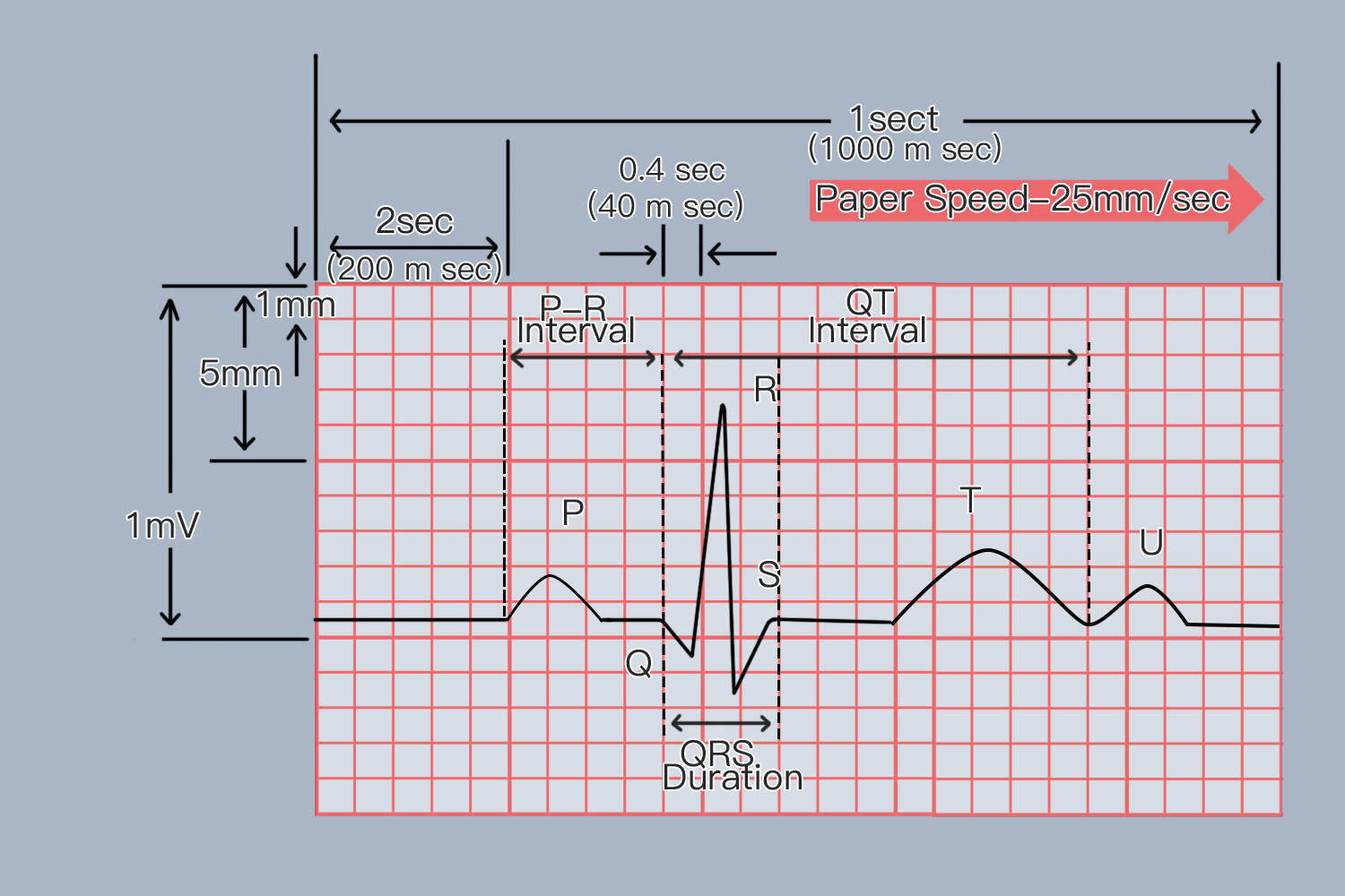 - 心电图的速率通常表示为纸速,即每秒钟心电图纸移动的距离。在标准设置下,纸速为25mm/s,这意味着每秒钟心电图纸会移动25个小格,即1秒等于25×0.04秒=1秒。