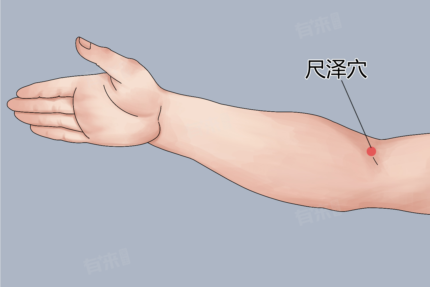 - 肃降肺气:尺泽穴五行中属水,为肺经的子穴,金气可化水,水液经肺气的肃降而下注于肾,因此尺泽穴具有一定肃降肺气的作用。