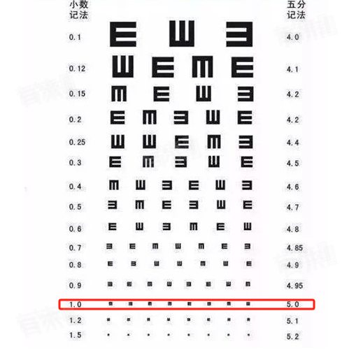- 视力5.0是使用对数视力表进行检测时得到的结果,表示测试者的裸眼视力在正常范围内且较为优秀。视力5.0并不直接对应国际标准视力的1.0度,但相当于小数视力表的1.0,显示人眼对物体的分辨力处于正常水平。