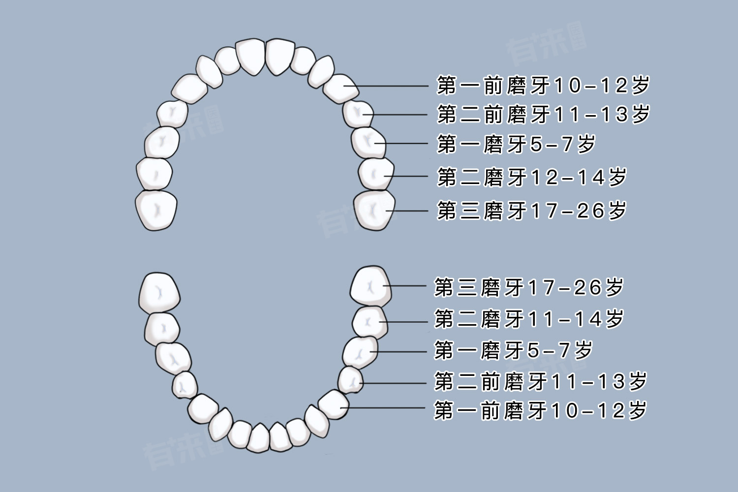 - 进入恒牙期,大牙数量有所增加。恒牙通常有28-32颗,其中大牙包含第一磨牙、第二磨牙以及部分人的第三磨牙,即智齿。第一磨牙,也就是俗称的“六龄齿”,在儿童6岁左右开始萌出,上下左右各一颗,共4颗。12-14岁第二磨牙萌出,同样上下左右各一颗,共4颗。至于第三磨牙,也就是智齿,萌出时间差异较大,一般在17-25岁开始萌出,部分人智齿先天缺失,所以智齿数量从0-4颗。这样算来,恒牙期大牙数量在8-12颗。