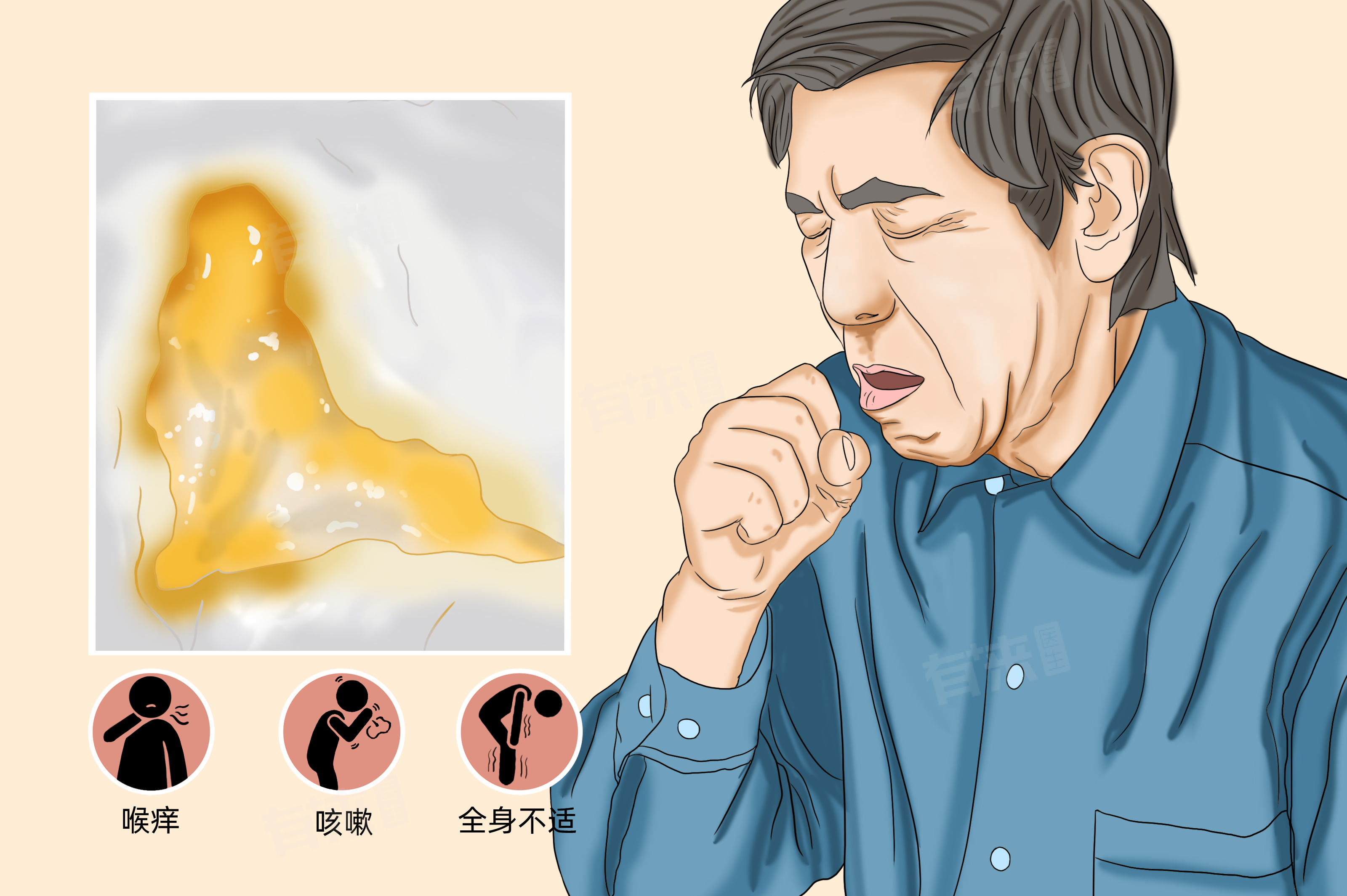 - 肺部感染:如肺炎,尤其是细菌性肺炎,肺泡和细支气管内充满炎性渗出物,这些渗出物与黏液、坏死的细胞等混合,形成了特别浓的黄痰。