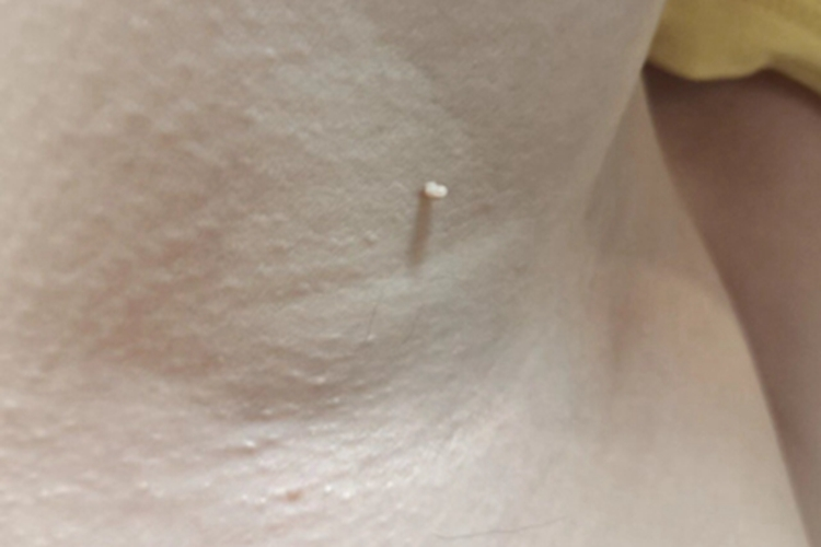 4、丝状疣:是由人乳头瘤病毒通过皮肤破损黏膜进入细胞造成感染、增生所引起的,可以导致患者腋下长小肉粒,质地较硬,顶端粗糙。部分患者可以自行痊愈,也可以采取激光治疗、液氮冷冻等去除疣体。