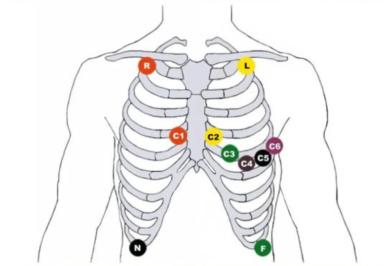 - 黄色:代表左臂导联(LA),位于患者左臂内侧。