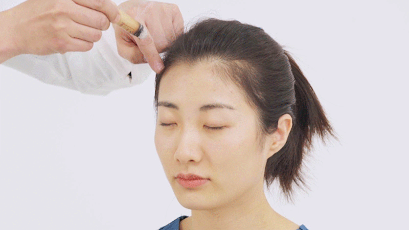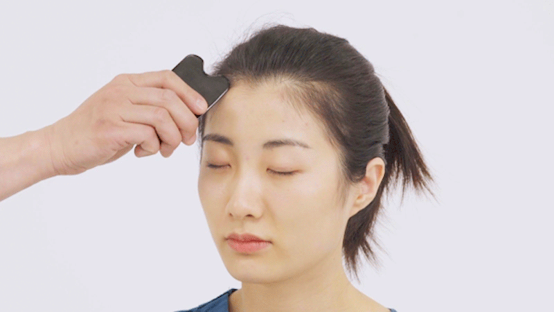 用刮痧板与皮肤呈45°,使用角刮法由内向外,对头临泣穴进行单向地刮擦,以局部皮肤潮红为度,可以辅助治疗头晕、目眩。