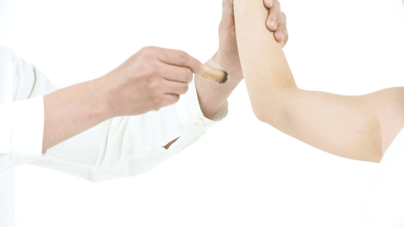 用刮痧板与皮肤呈45°自上而下单向刮擦少海穴,每次3-5分钟,隔天一次,可以缓解肘臂的挛痛、手麻等证。