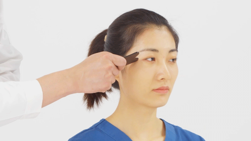 取穴时,患者取仰卧位或坐位,在目外眦的外侧,眼眶的外缘可触及一个凹陷,瞳子髎(穴)就在凹陷当中。