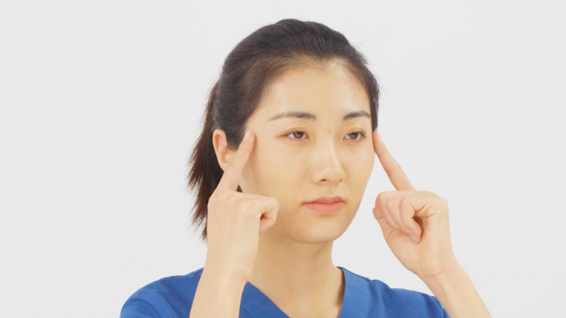 用双手的食指同时按压双侧的瞳子髎穴,随着呼吸,吸气时向上向前按揉,呼气时向下向后按揉,每天最少按揉8次,最多按揉64次,可以缓解眼部的疾患。