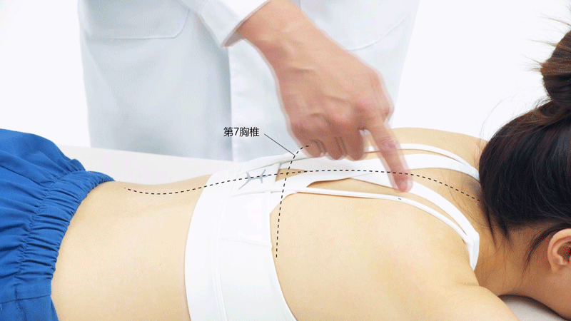 取穴的时候,患者呈坐位或俯卧位,两个肩胛下角横平第7胸椎,后正中线与肩胛骨内缘的距离是3寸,一半就是1.5寸了,这样我们就在第七胸椎棘突下旁开1.5寸的位置找到了膈俞穴。
