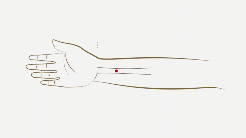 取穴时,患者伸臂,微屈腕,先找到腕横纹。然后自腕横纹向上量两寸,即三个手指并拢的宽度,在两筋正中央的凹陷处,即为内关穴。