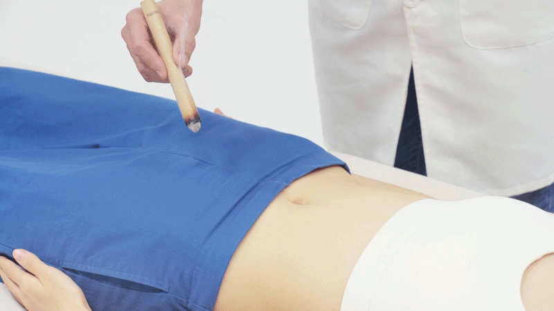 用艾条距离皮肤3-5厘米,悬灸10-15分钟就可以了,可以治疗腹痛、带下病。