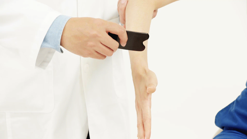 用角刮法从上向下刮拭阳溪穴,力度稍重,以出痧为度,可缓解发热无汗、头痛、牙痛等。