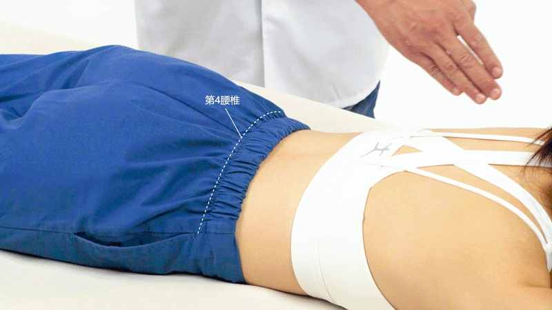 取穴的时候,患者取俯卧位,两个髂脊连线,横平第四腰椎,这样我们就在后正中线第四腰椎棘突下方找到了腰阳关穴。