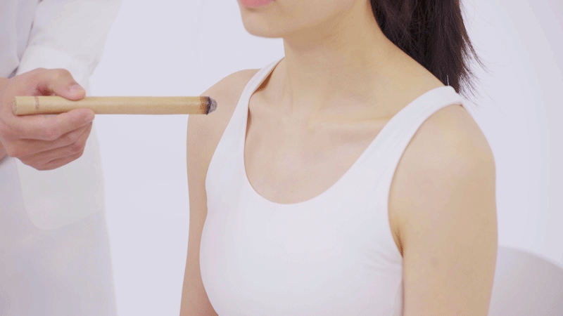 用艾条在距离皮肤3-5cm处对屋翳穴进行悬灸,灸治5-10分钟,有止咳化痰的作用。