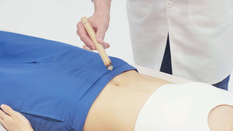 用艾条在距离皮肤3-5cm处对天枢穴进行悬灸,灸治10-15分钟,可以治疗腹痛、腹胀。