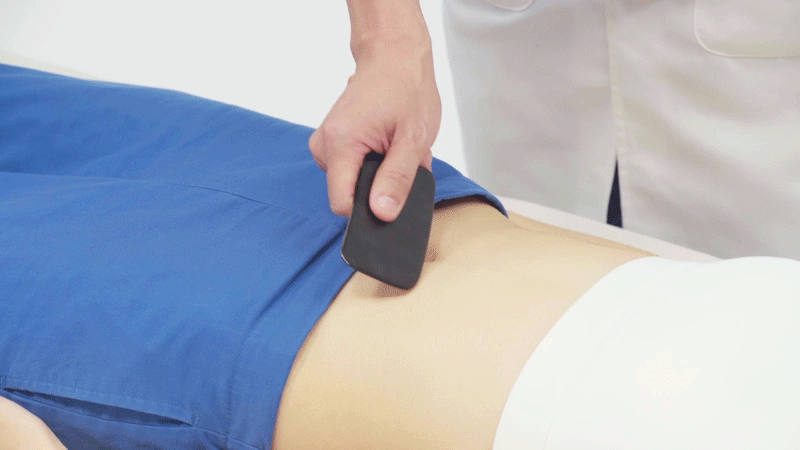 用刮痧板与皮肤呈45度,自上而下对天枢穴进行单向刮擦,以局部皮肤潮红为度,每次刮擦2-3分钟,可以辅助治疗肠鸣、腹泻。