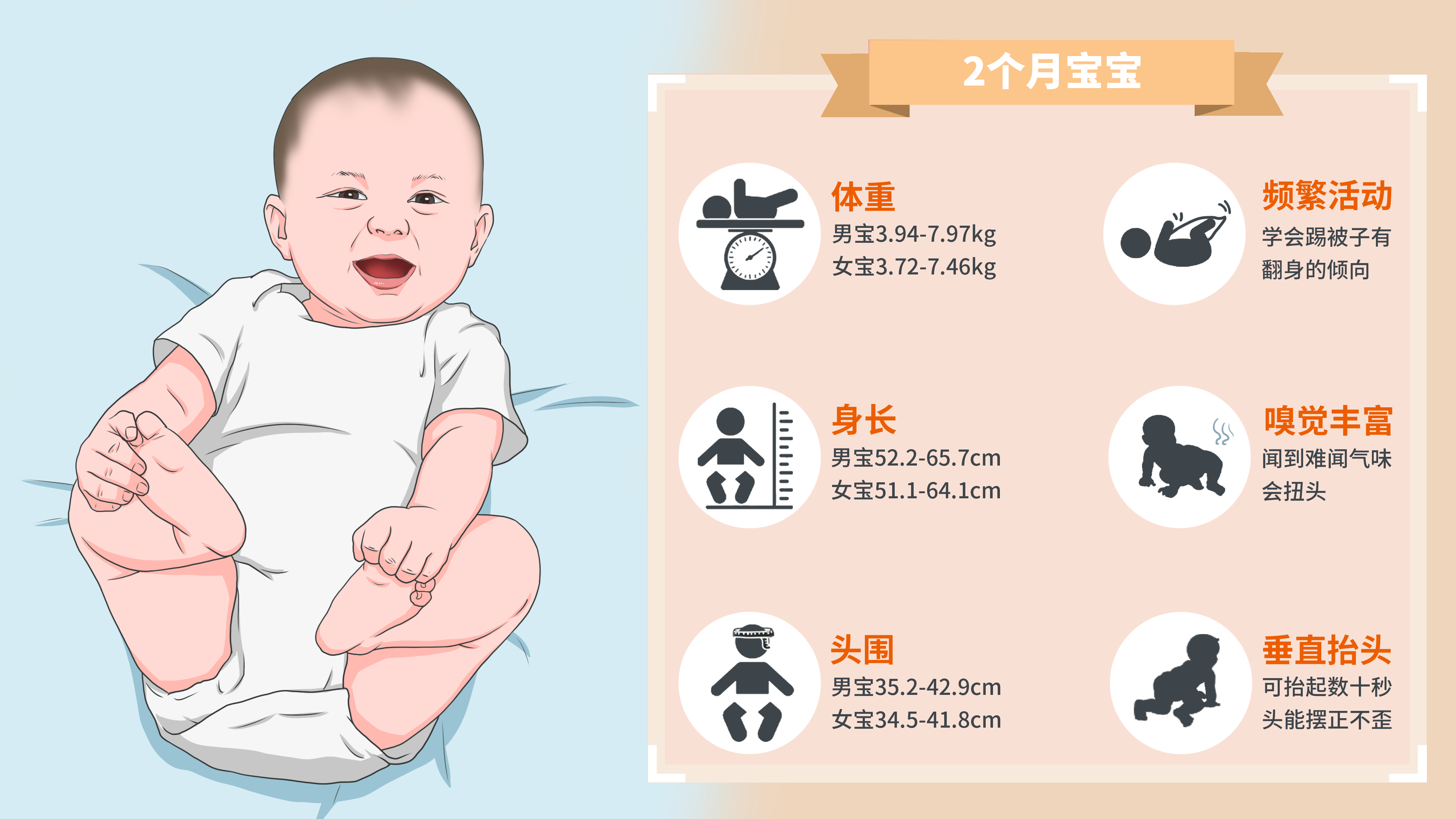 宝宝趴着时,能将头抬起数十秒,头能摆正不歪。在抱他时,脖子不会太软,头能伸直,几乎不用扶托。能持续几分钟转头至45°。肢体活动频繁,力量增加,学会踢被子,有了翻身的倾向。