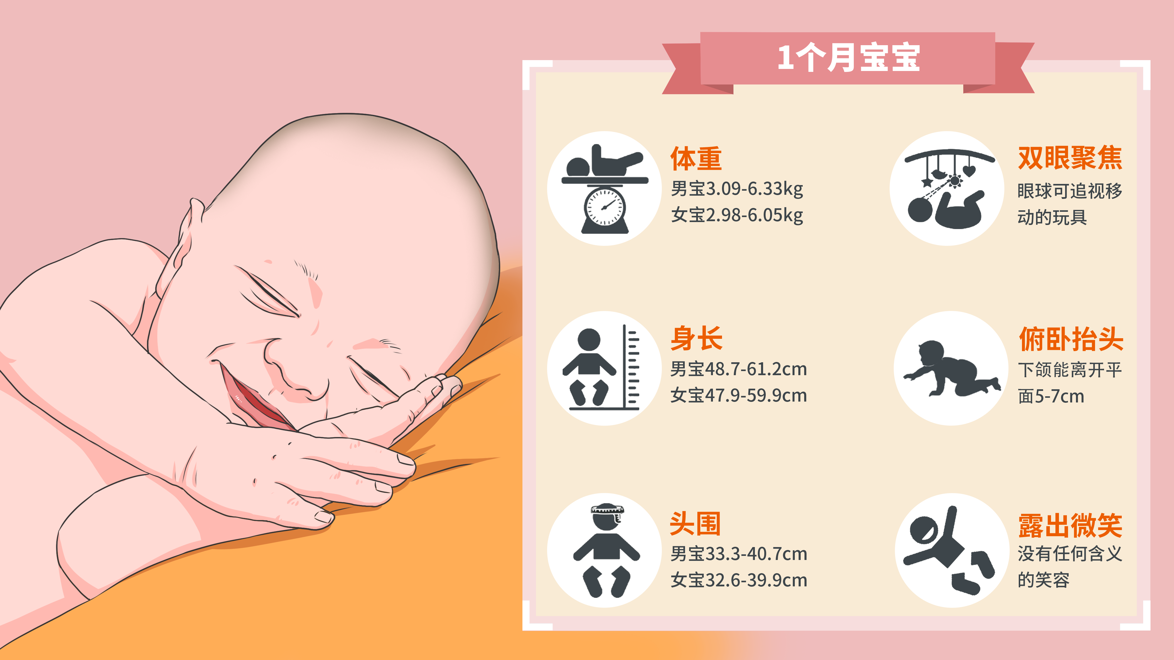 1个月的宝宝能逐渐聚焦双眼,眼球能追视一只移动的玩具。接近2个月时,可以对1m以外的物体注视数秒。