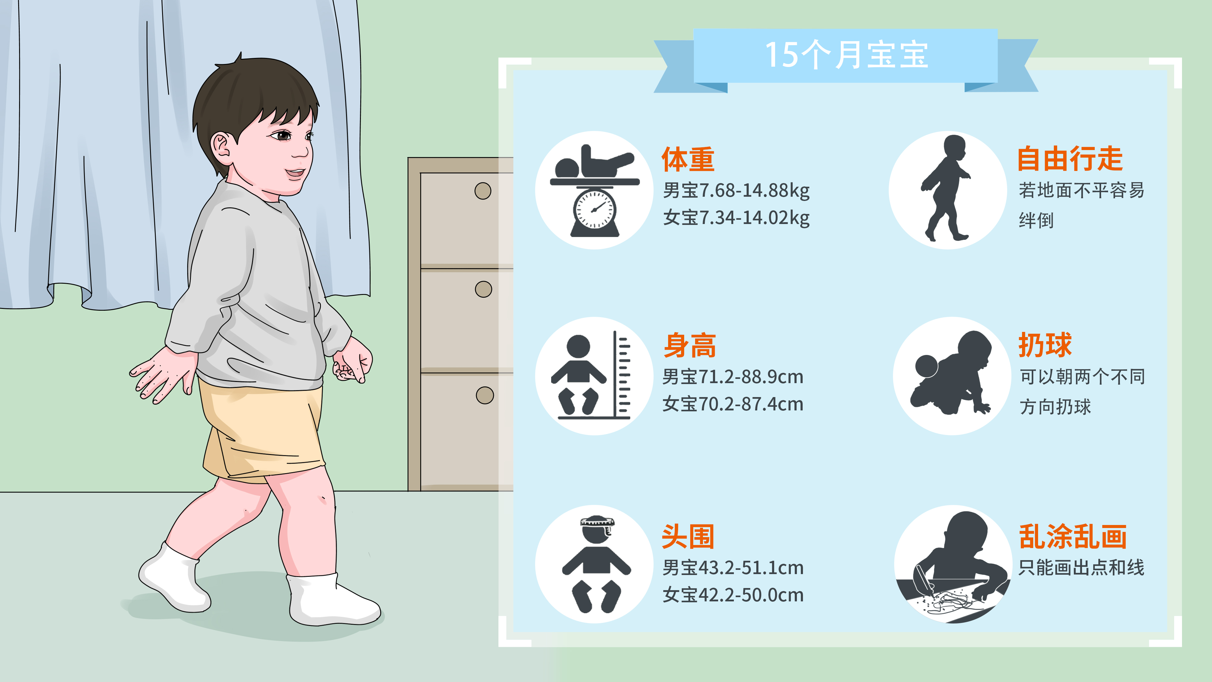 15个月的宝宝走路已经比较稳了,但自己还不会注意脚下,如果路面不平,则容易被绊倒。另外,此时期的宝宝开始喜欢试探着往更高的地方、更危险的地方爬,能拉着家长的手上下楼梯或双手扶着栏杆上楼梯。随着手眼协调能力的进一步发展,宝宝此时可以朝两个不同的方向扔球。