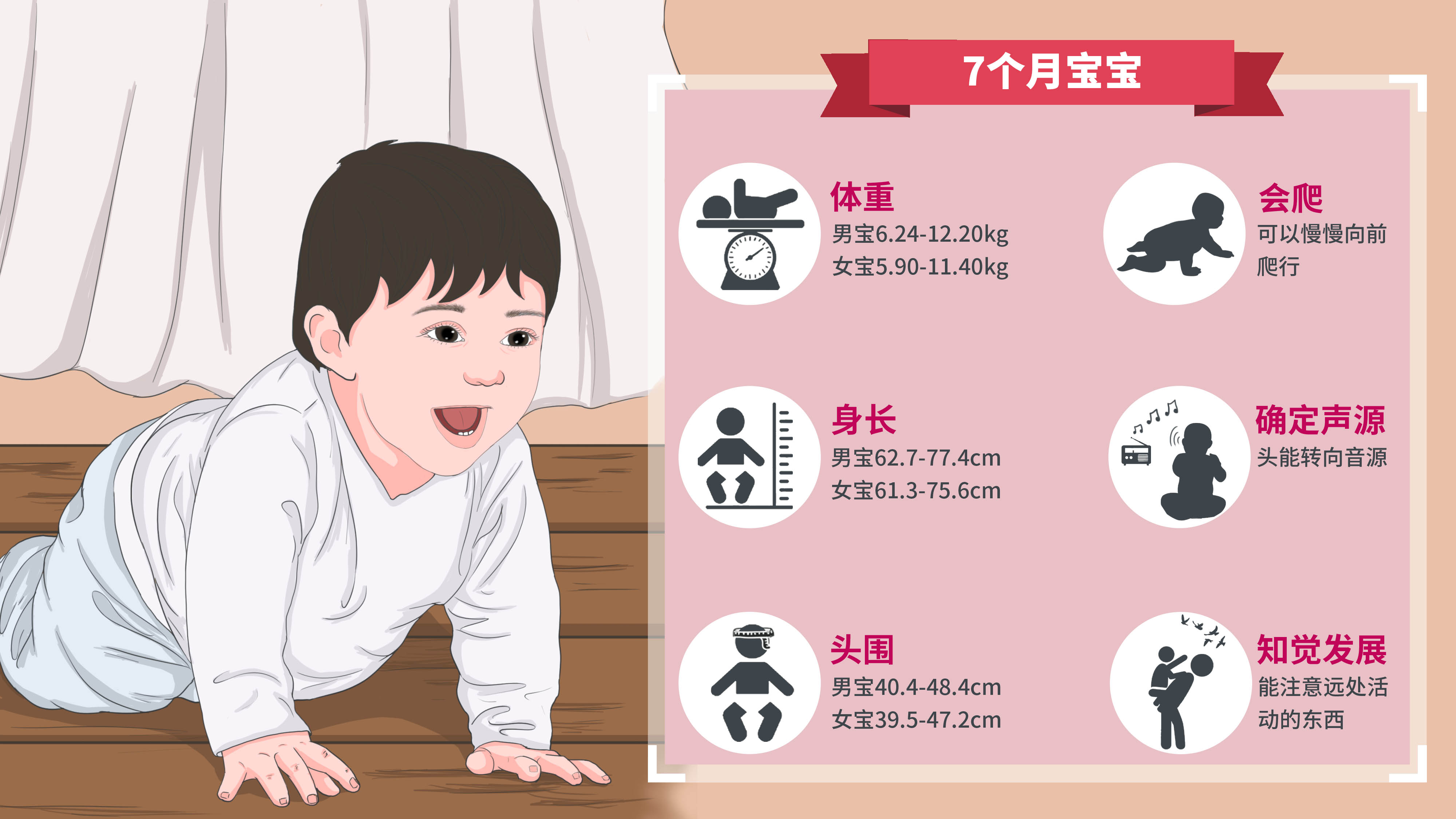 7个月宝宝这时候可以稳定抬头,能用双手向前撑住独坐,可以有意识地从仰卧位翻身至俯卧位,然后从俯卧位翻身至仰卧位,还可以慢慢的向前爬行。这个月的宝宝如果扶着他,能够站得很直,并且喜欢在扶立时跳跃。把玩具等物品放在宝宝面前,他会伸手去拿,并放进自己口中。