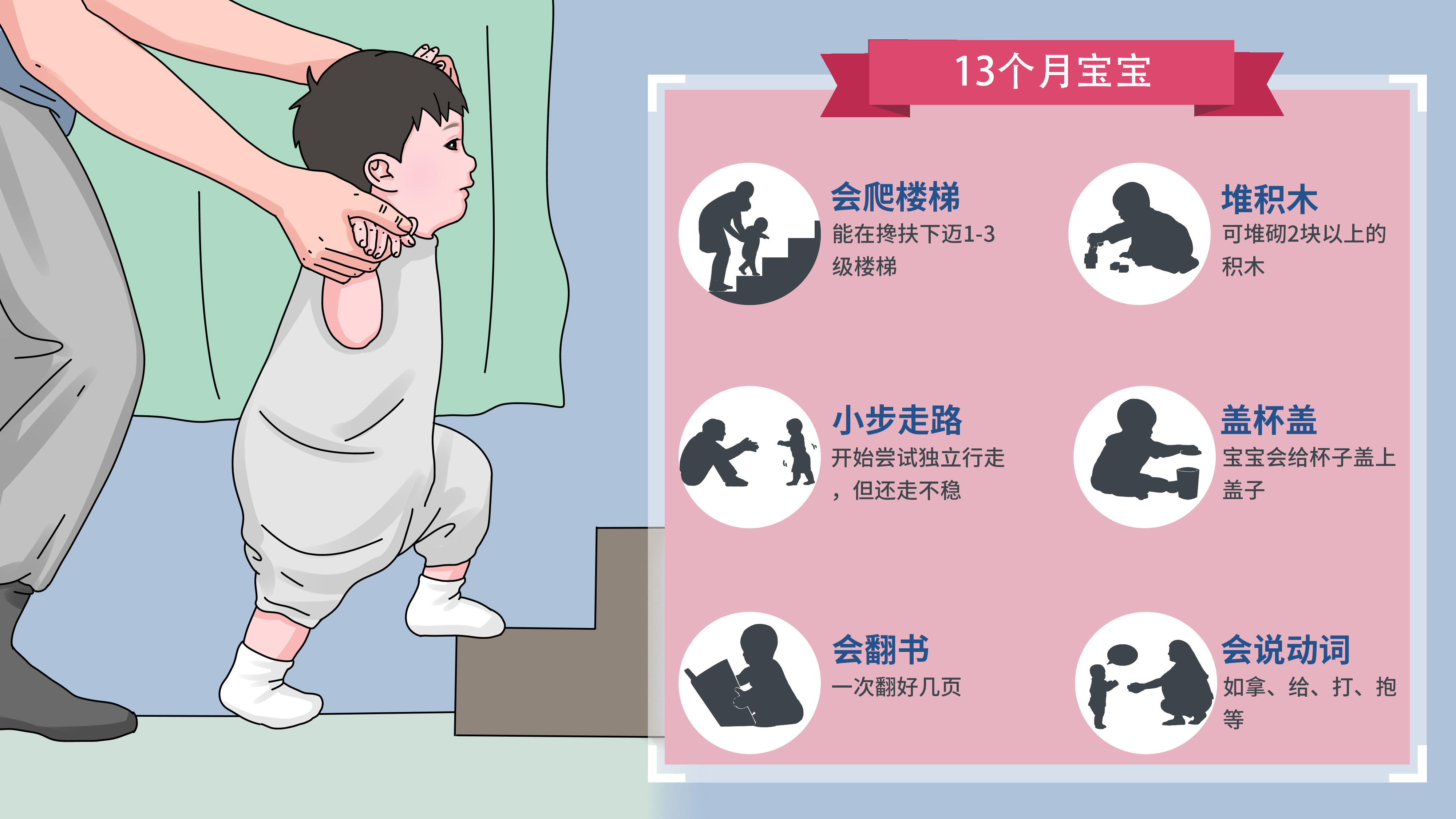 宝宝13个月时喜欢爬上爬下,会用手及膝爬楼梯、爬椅子,也能在妈妈的搀扶下迈下1-3级的楼梯,能用整个身体做投球动作。用汤匙喂食时,会握住照顾者的手。帮他穿衣时,可自行调整适当体位以配合。大部分宝宝开始尝试独立行走,但还走不稳,可以小步走路。