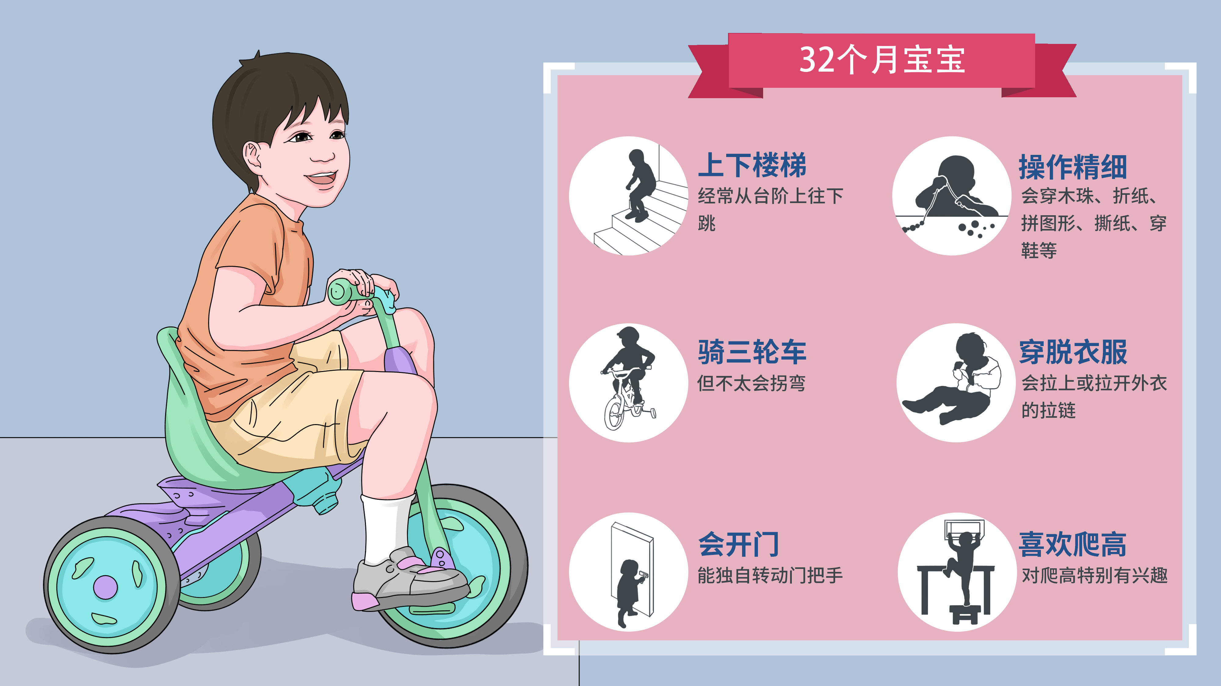 这一时期的宝宝,走路更有节奏,基本动作发展较为显著,逐渐完成了跑、跳、踢、抛接球,接取物体时上身的动作仍然显得僵硬,能边走边推小童车,但经常把握不住方向。宝宝现在已经会骑小三轮车,但是有的宝宝不太会拐弯。能自由上下楼梯、经常从台阶上往下跳,还对爬高特别有兴趣。