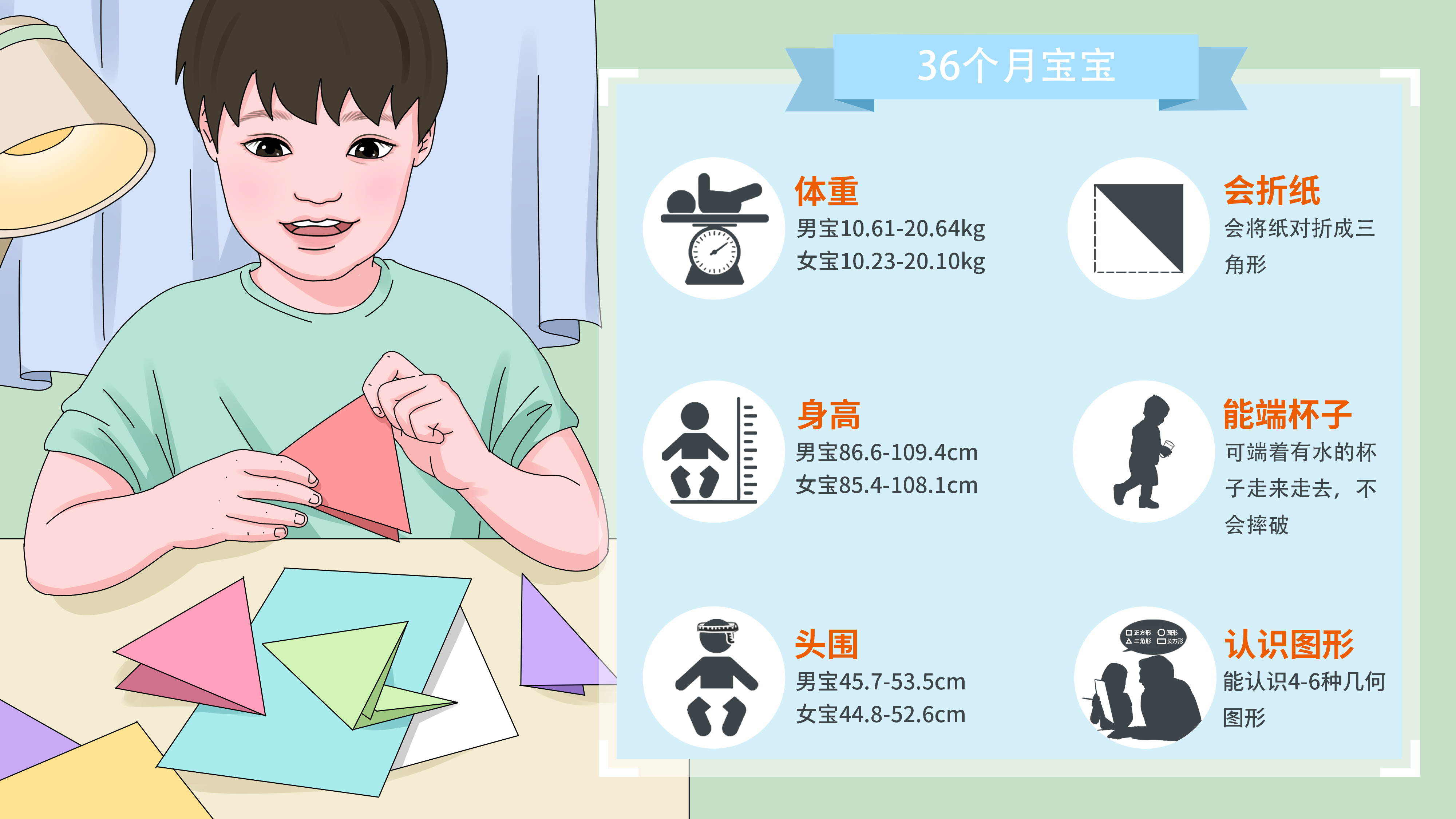 36个月宝宝能做两人游戏,初步懂得遵守规则。会注重自己的外貌,注意自己衣服整洁,有一定的想象力和创造力,会开始学习构思自己的行动内容,并通过双手实现,比如想象搭一个高楼,然后用不同的积木完成它。