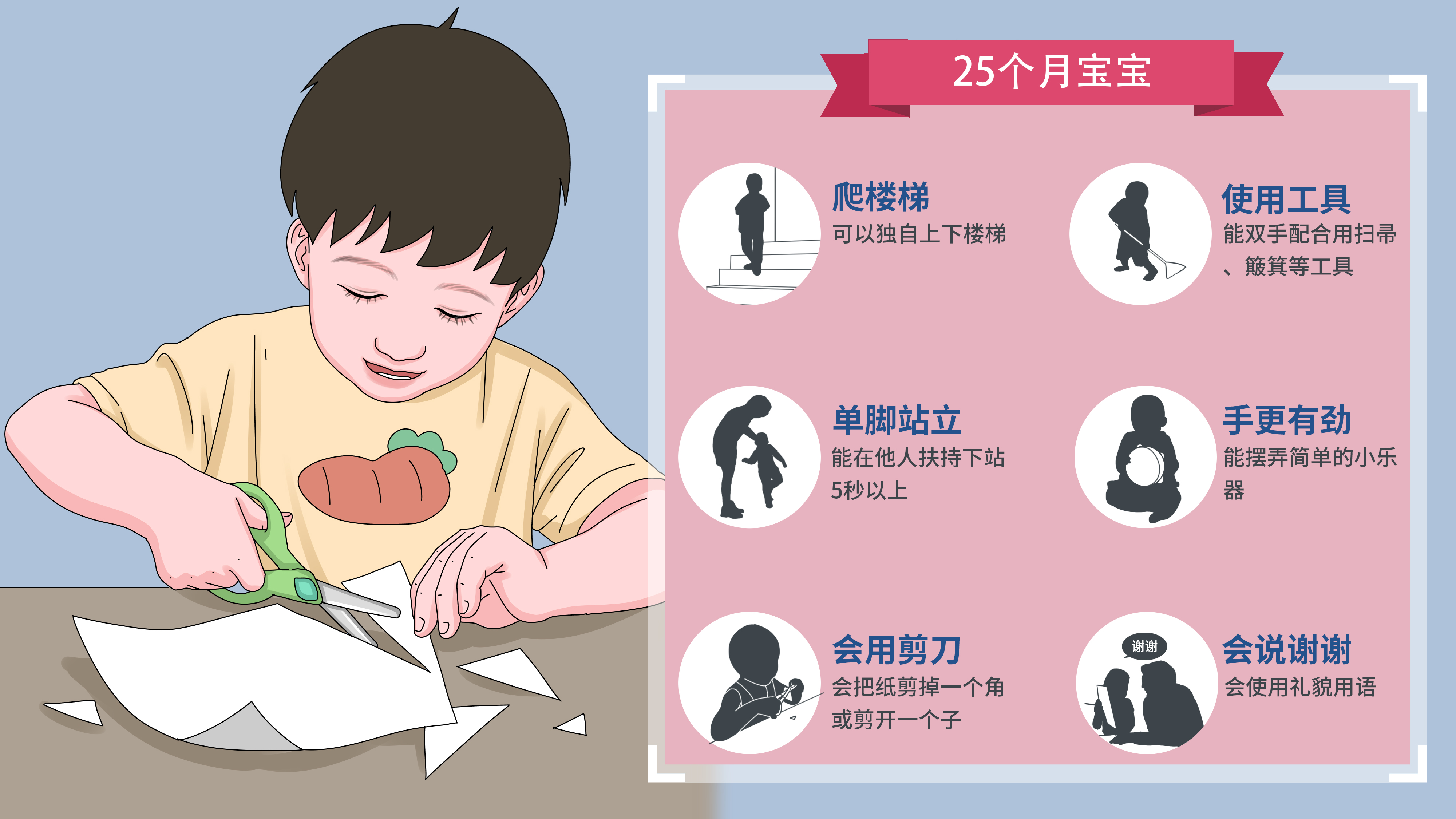 宝宝此时手部较为灵活,会用剪刀剪东西,会把纸剪掉一个角或剪开一个口子,也能双手配合用扫帚、簸箕等工具。小手更加有劲了,能摆弄一些简单的小乐器。