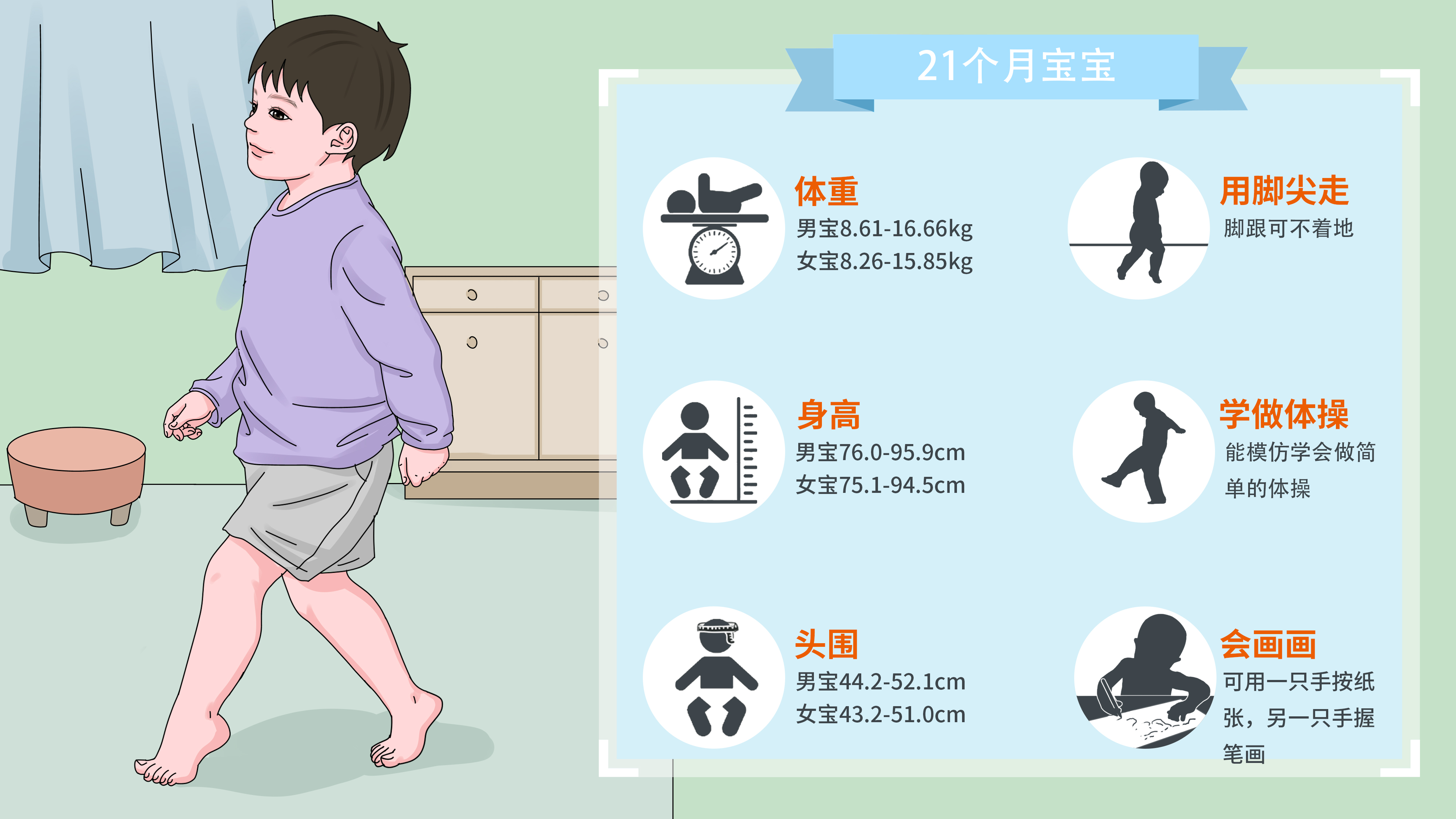 这个月龄的宝宝能够用脚尖行走,脚跟可不着地,能手扶楼梯栏杆熟练地上楼梯。还可以进行跑步的运动,可以由静止的状态变成跑步,也可以由跑步成走路,还能够在跑步中停止前进。在大人的指挥下,能模仿学会做简单的体操,能跟着音乐跳舞。