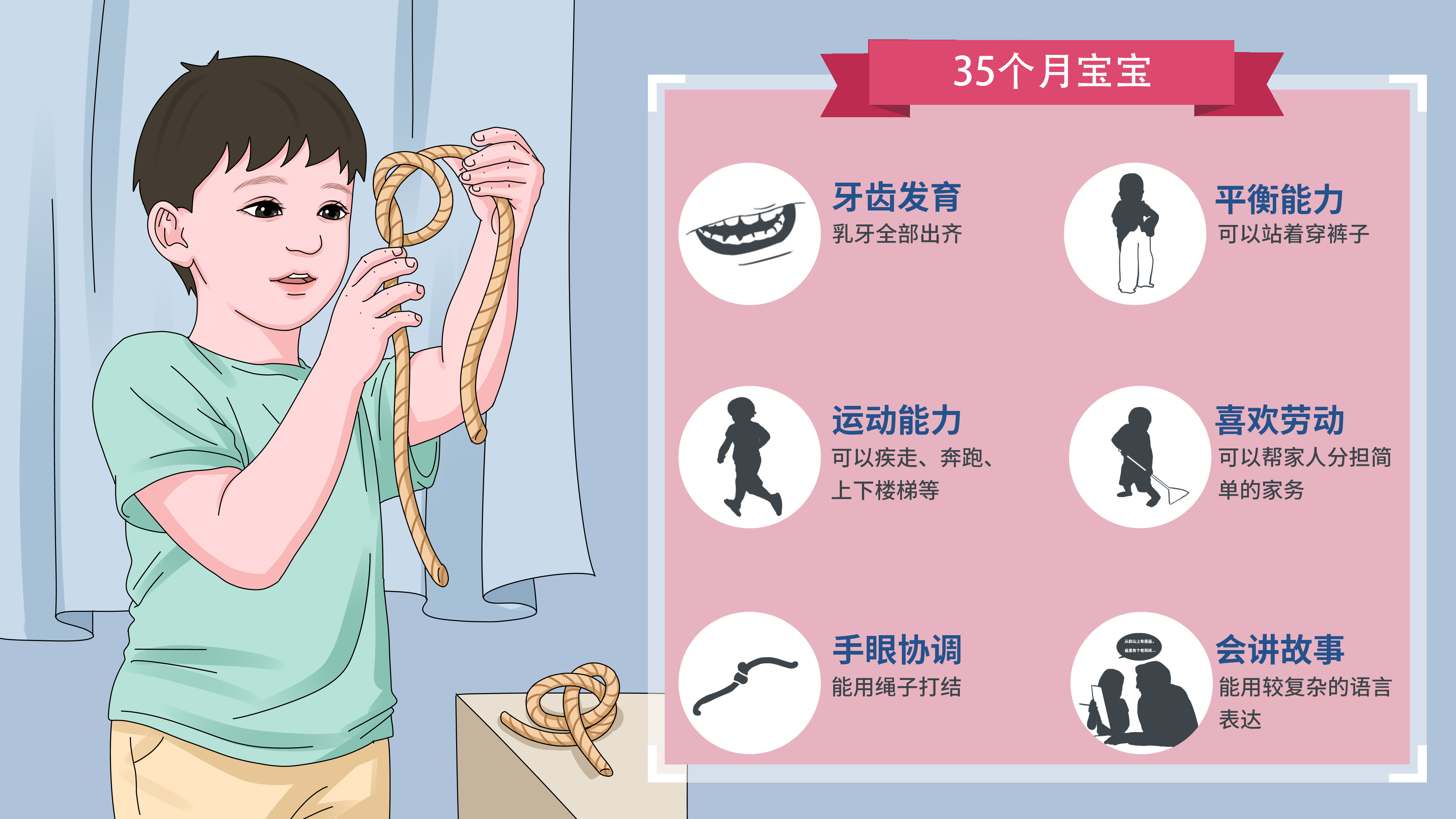 35个月时,宝宝手脚功能较发达,能与眼睛协调配合,能用绳子打结、使用筷子,站着穿裤子,还会进行弹玻璃珠等游戏。