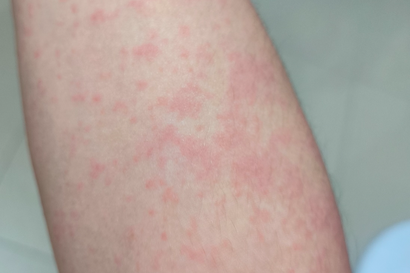 3.皮疹:发病后2-5天,多数患者会出现斑丘疹,主要分布于躯干、四肢及掌跖部位,可伴有瘙痒,数天后逐渐消退并伴轻微脱屑。