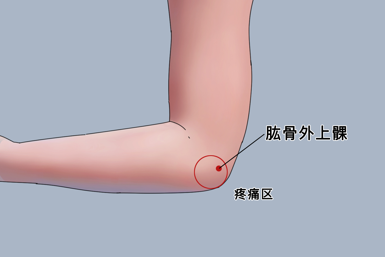 肱骨外上髁位于肱骨下端的肱骨小头外侧,即手肘外侧。肱骨下端较扁,外侧部前面有半球状的肱骨小头,与桡骨相关节;内侧部有滑车状的肱骨滑车,小头外侧和滑车内侧各有一突起,分别称外上髁和内上髁,肱骨外上髁可在体表扪及。