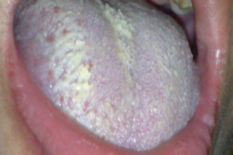 双侧舌缘呈现白色或灰白色斑块,可蔓延至舌背和舌腹。呈垂直皱褶,有的因过度增生而呈毛绒状,不能擦去。