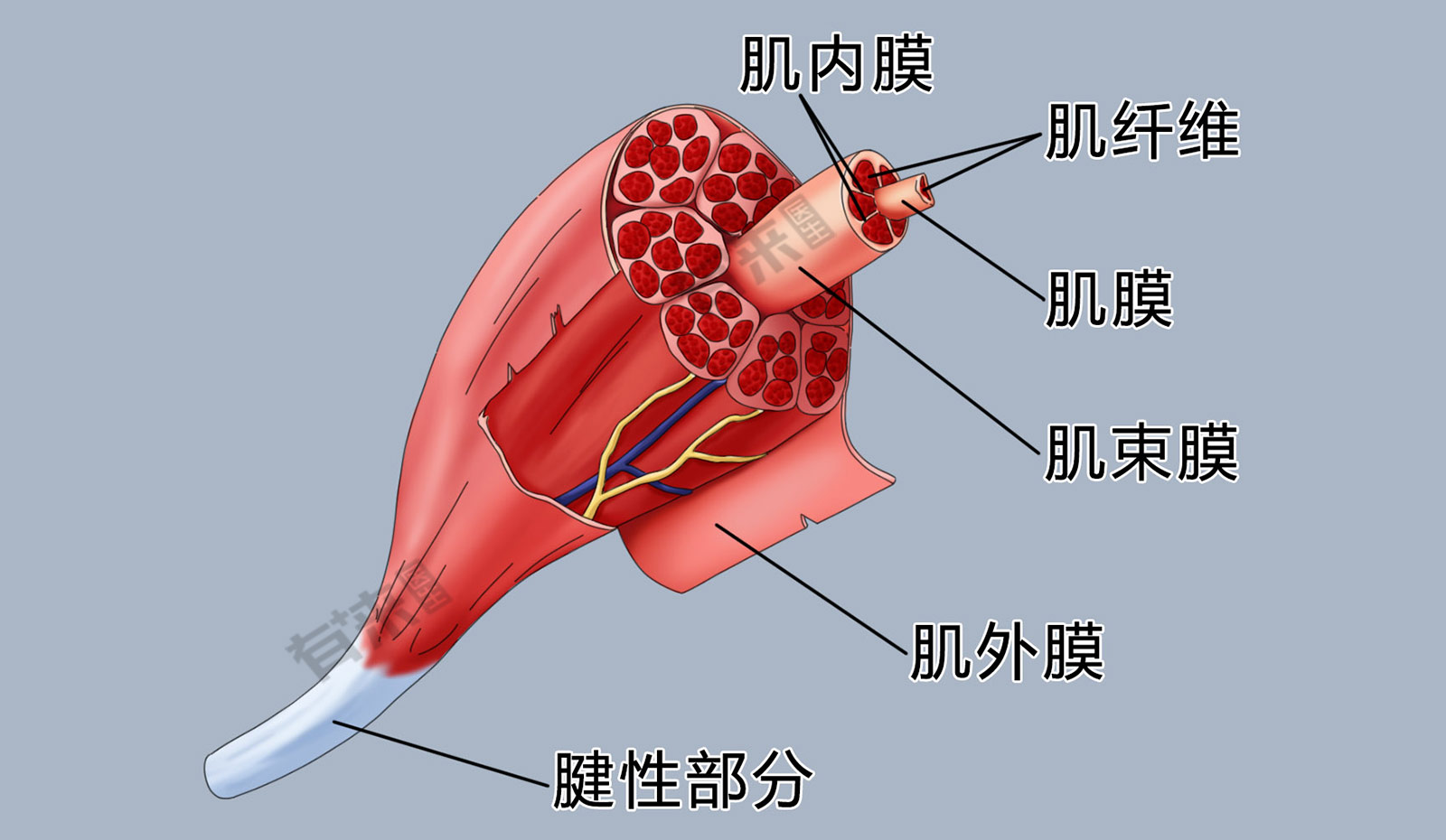 前锯肌为宽大的扁肌,其腱性部分呈薄膜状,称腱膜。前锯肌主要由具有收缩功能的肌细胞构成,肌细胞间有少量结缔组织、血管、淋巴管及神经,其细胞膜称肌膜, 细胞质称肌质。前锯肌借肌腱附于骨骼,致密结缔组织包裹在斜方肌外面形成肌外膜,肌外膜的结缔组织伸入肌内,将其分隔形成肌束,包裹肌束的结缔组织称肌束膜,分布在每条肌纤维外面的结缔组织称肌内膜。