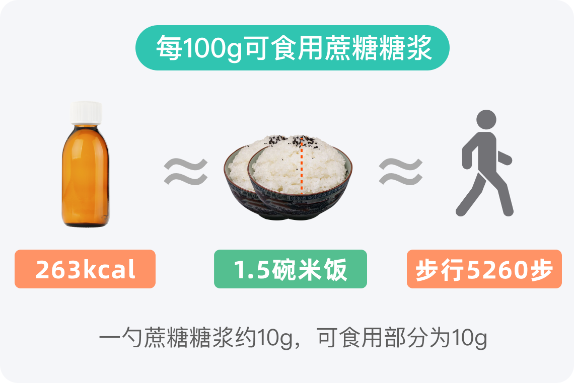 每100g蔗糖糖浆的热量为263kcal,在食物热量表中处于较高水平。一勺蔗糖糖浆的可食用部分约为10g,其热量为26kcal。这一热量相当于约1/7碗米饭的热量。在一顿成人餐食中,这一热量占比不高,但频繁或过量摄入则会显著增加总热量。