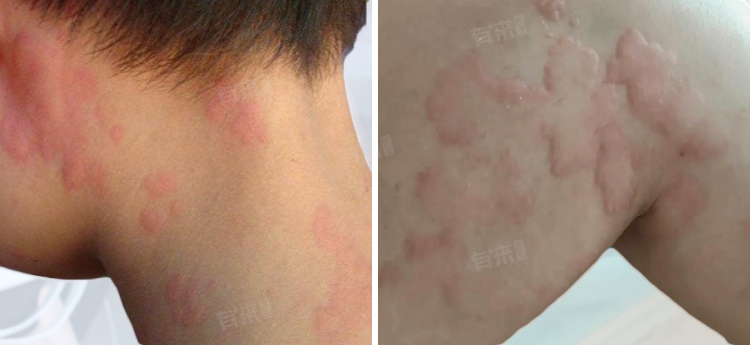 2、荨麻疹:皮肤上出现大小不等、形状不规则的风团,颜色可呈红色或苍白色,伴有剧烈瘙痒,风团可在数小时内消退,但可能会反复出现。