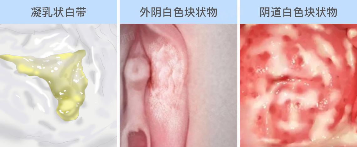 阴道和外阴黏膜红肿,表面附有白色块状物,擦除后可露出红肿黏膜面,急性期还可见糜烂及浅表溃疡。