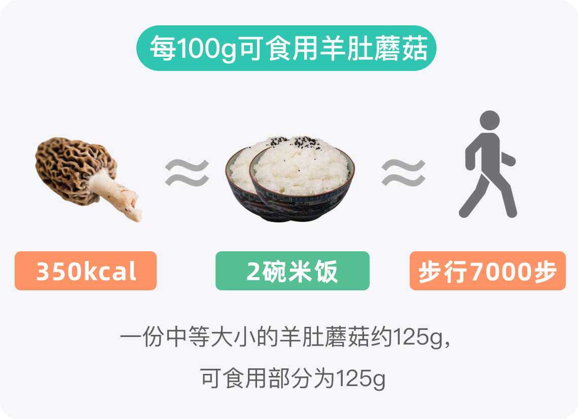 羊肚蘑菇每100g热量350kcal,一份可食用部分约125g的羊肚蘑菇热量为438kcal,相当于2.5碗米饭。对于一般成人而言,一日所需热量大约在2000-2500kcal,因此100g羊肚蘑菇所提供的热量约占每日总热量需求的14%-17.5%。