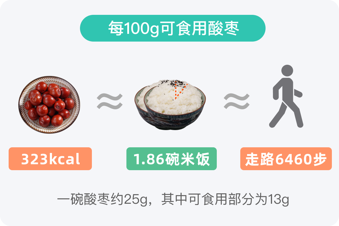 以100g米饭热量116kcal、一碗米饭150g(热量约174kcal)来计算,100g酸枣的热量约是100g米饭热量的2.8倍,约是一碗150g米饭热量的1.86倍,所以对于减肥人群而言,要尽量少吃酸枣这类高热量食物。