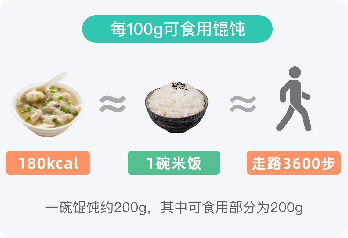 一碗馄饨大约200g,食用后所产生的热量约360kcal,相当于2碗熟米饭的热量。如果一个人一天的总热量需求为2000kcal,那么200g馄饨提供的热量约占一餐的36%。