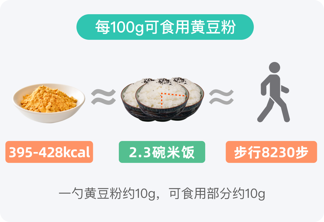 黄豆粉的可食用部分几乎是100%,因为黄豆粉是由黄豆经过研磨加工而成,去除了大部分的外壳和杂质,保留了黄豆的精华部分。一勺黄豆粉约10g,可食用部分约10g,其热量大约为41kcal。为了更直观地理解这一热量水平,我们可以将其与米饭进行对比。通常,每100g米饭的热量约为116kcal,一碗米饭约150g。一勺黄豆粉的热量,约为1/5碗米饭的热量。