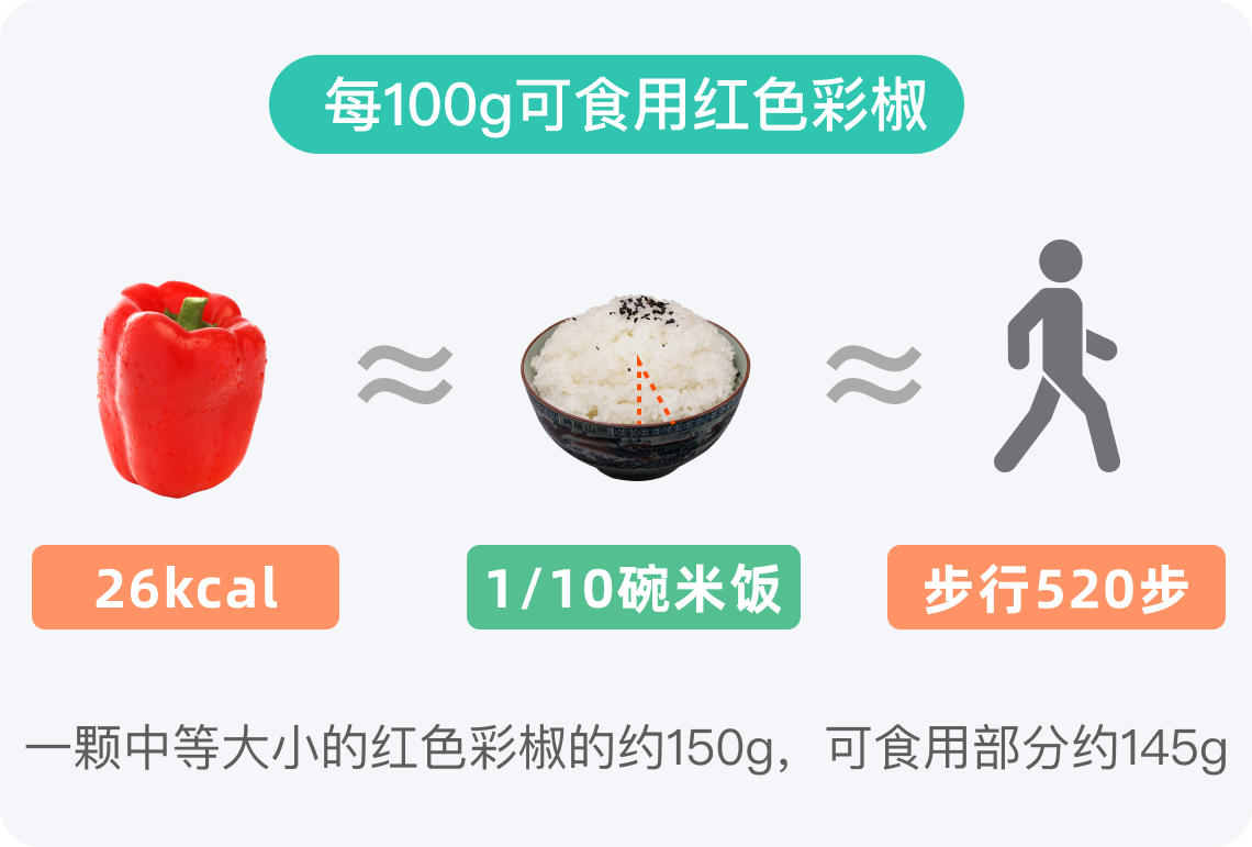 一颗中等大小的红色彩椒约150g,可食用部分约145g,其热量约为38kcal。作为对比,米饭的热量约为116kcal/100g,一碗米饭约150g。因此,食用一颗中等大小红色彩椒的热量,相当于食用1/5碗米饭的热量,显示出红色彩椒在热量控制方面的显著优势。