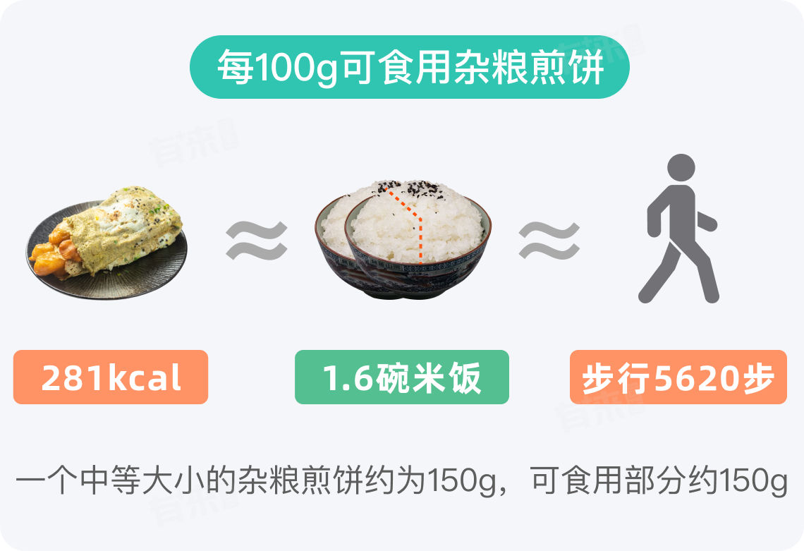 在营养学上,一般每100g热量低于100kcal的食物被视为低热量食物,100-200kcal为中热量食物,超过200kcal为高热量食物。因此,杂粮煎饼的热量处于高热量范畴。一个中等大小的杂粮煎饼约150g,热量为422kcal,相当于2.4碗米饭的热量。如果一餐的热量为600kcal,100g杂粮煎饼约占一餐热量的47%。