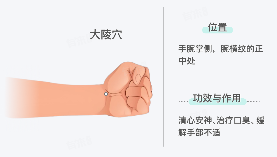 2、治疗口臭:大陵穴具有清泻心火和脾胃之热的作用,能有效治疗因心脾之火上攻所致的口臭。对于心火旺盛引起的口臭患者,刺激大陵穴可以起到很好的疗效。