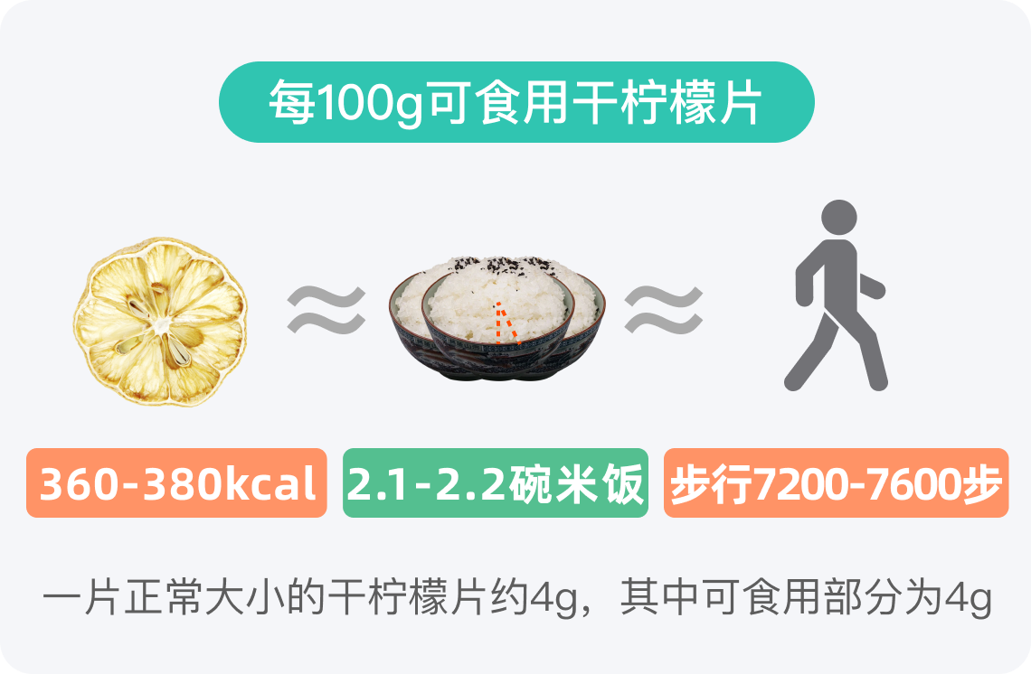 在营养学上,每100g食物热量低于100kcal的为低热量食物,100-200kcal为中热量食物,高于200kcal为高热量食物。每100g可食用干柠檬片热量在360-380kcal,属于高热量食物。一片中等大小的干柠檬片可食用部分为4g,热量约为14.4-15.2kcal,为0.08-0.09碗米饭。对于部分成年人一餐500-800kcal的热量需求而言,几片干柠檬片所占比的热量虽不多,但也需注意,尤其是在大量食用或搭配其他高热量食物时。