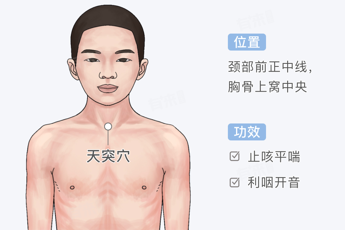 2、利咽开音:天突穴位于咽喉附近,直接作用于喉部组织,可以显著改善咽喉部位的血液循环,减轻炎症反应,缓解疼痛、干燥、异物感等症状,对于急慢性咽炎、扁桃体炎等咽喉疾病,刺激天突穴不仅能够缓解局部症状,还能增强机体免疫力,预防复发。