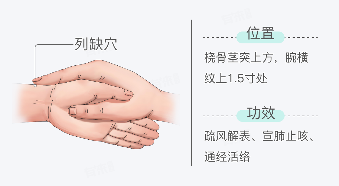 2、推法:用拇指指端按在列缺穴上,有节律而缓慢均匀地推动,帮助疏通经络,每次持续3-5分钟,每天2-3次。