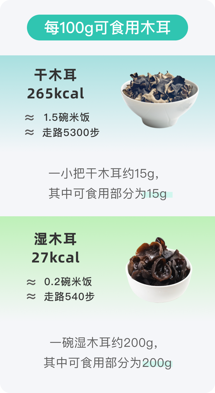 从营养学的角度来看,食物依据每100g提供的热量可以被大致归类为:低热量:<100kcal/100g、中热量:100-200kcal/100g、高热量:>200kcal/100g,由此可见热量为265kcal/100g的干木耳属于高热量食物,热量为27kcal/100g的湿木耳属于低热量食物。一次吃15g干木耳所产生的热量约40kcal,差不多是200g湿木耳的热量,大约0.2-0.3碗米饭的热量。