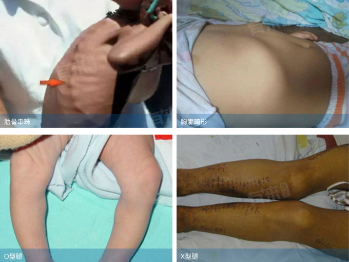 - 骨骼改变:儿童和青少年可能出现颅骨软化、方颅甚至鞍状或十字状颅形,囟门闭合延迟、牙釉质缺乏并易患龋齿,出现肋骨串珠、胸廓畸形,下肢呈O型腿或X型腿,还可出现脊柱后突或侧弯畸形。成人则可能出现腰背部疼痛、肌肉无力等现象。老人可有自发性骨折,也可引起肌肉痉挛、小腿抽搐等症状。