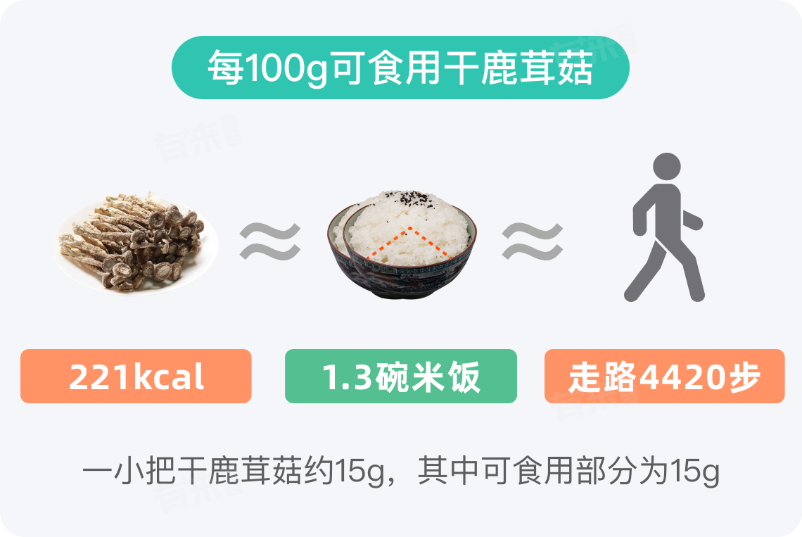 一次食用15g干鹿茸菇,其产生的热量为33kcal,相当于1/5碗米饭的热量,大约运动5-10分钟即可消耗。